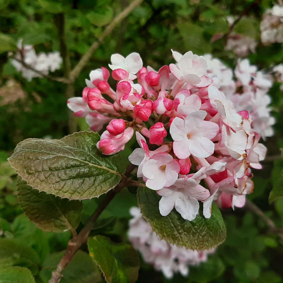 Sűrű, lekerekített bokrot adó, szárazságtűrő, lombhullató cserje, melynek magassága és szélessége elérheti a 1,8 m-t. Sötét rózsaszín bimbóiból áprilistól nyíló, rendkívül illatos, rózsaszín, nagyméretű, gömbölyű virágzatok fejlődnek,majd kifehérednek, és elborítják a bokrot. Belőlük apró,fényes, vörös bogyók fejlődnek, melyek táplálékul szolgálnak a hazánkban telelő madaraknak. Lombját bronzos árnyalatban kihajtó, tojásdad, poros, sötétzöld levelek alkotják, melyek ősszel ragyogó vörös árnyalatúra színeződnek. Kiváló választás kiskertekbe szoliterként ültetve, de cserjecsoportok, virágos sövények kialakításához is használhatjuk.